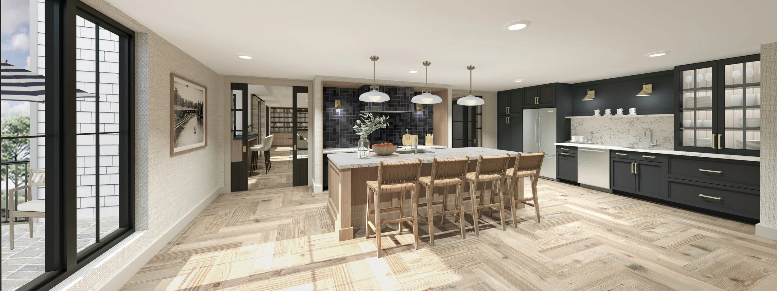 The building was meticulously crafted to celebrate its natural surroundings and introduce contemporary touches. Soft blue-grays throughout the interiors pay homage to the lakeside location, while rich greens reference the adjacent woods. From the warm white oak paneling, to the high-end lighting fixtures, the spaces set the tone for this new brand of community living.
