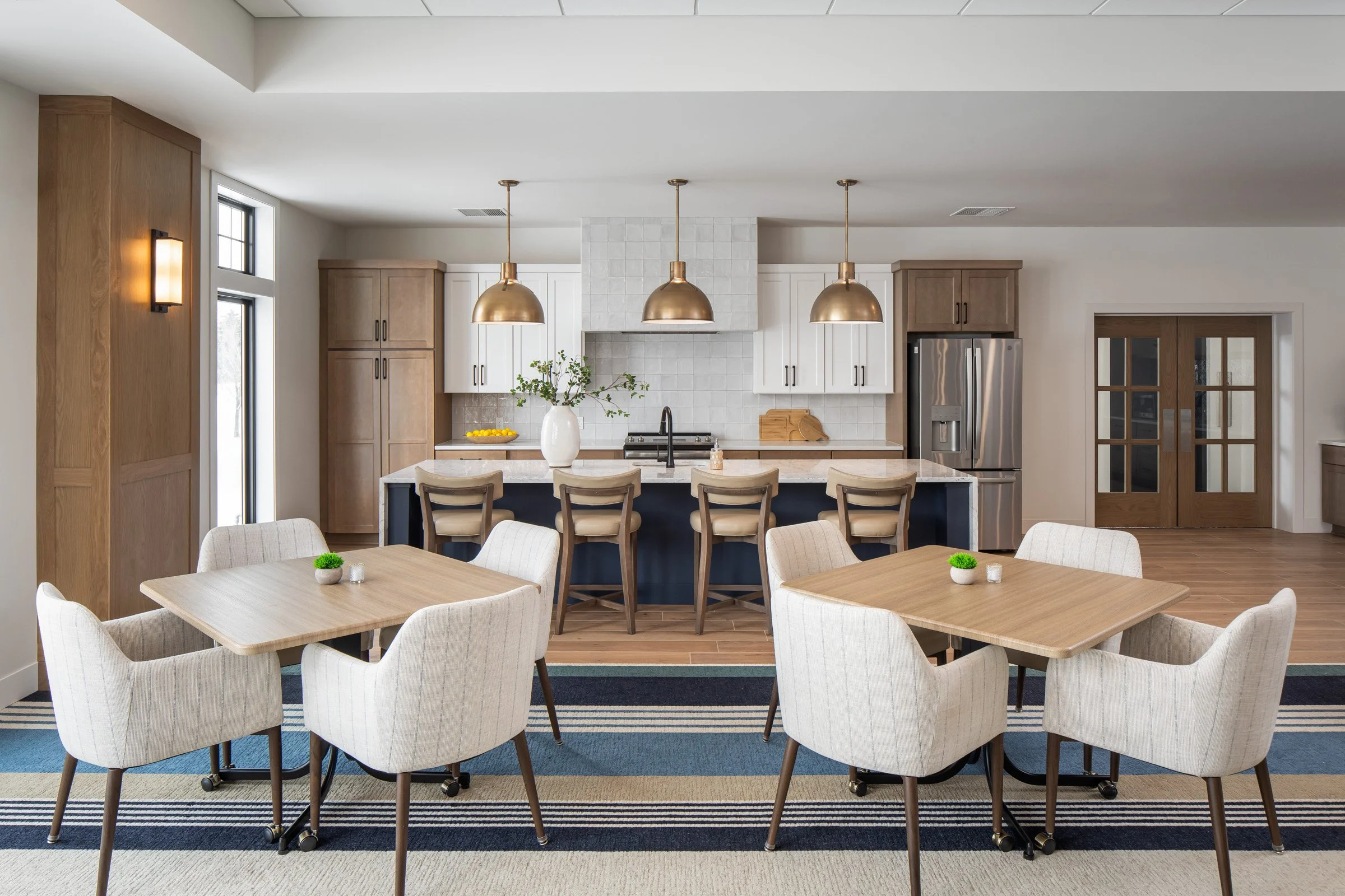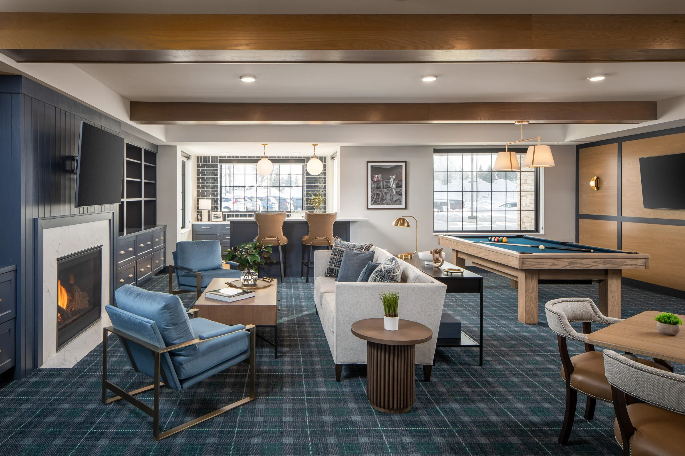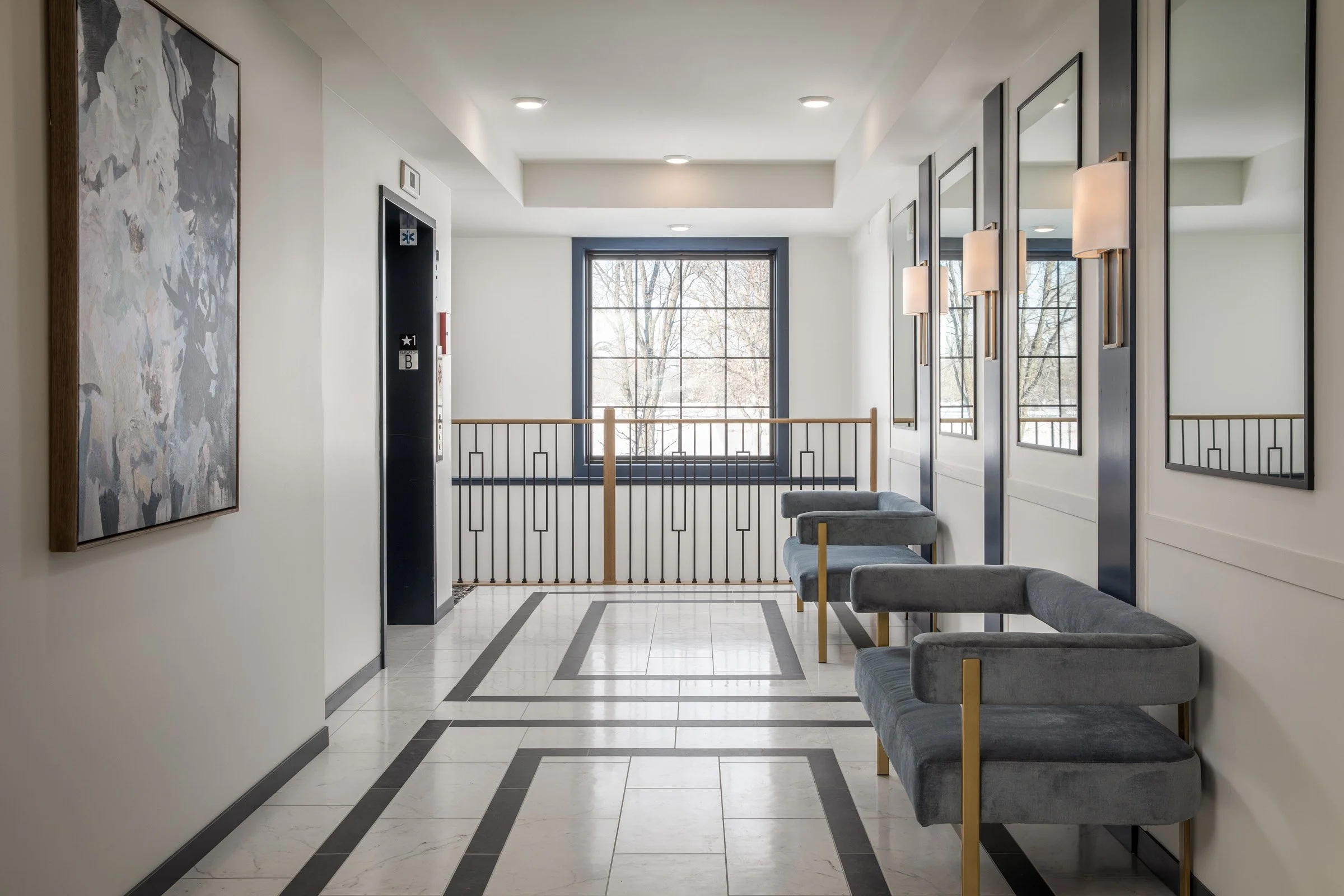 The building was thoughtfully designed to blend luxury and functionality, offering expansive layouts, refined finishes, and panoramic views of lush greens. With a nod to the preppy aesthetic of the adjacent golf course, the design combines classic golf charm with contemporary sophistication. The common areas feature a rich palette of navys, blues, emeralds and cognacs, evoking a modern sophisticated take on timeless elegance.