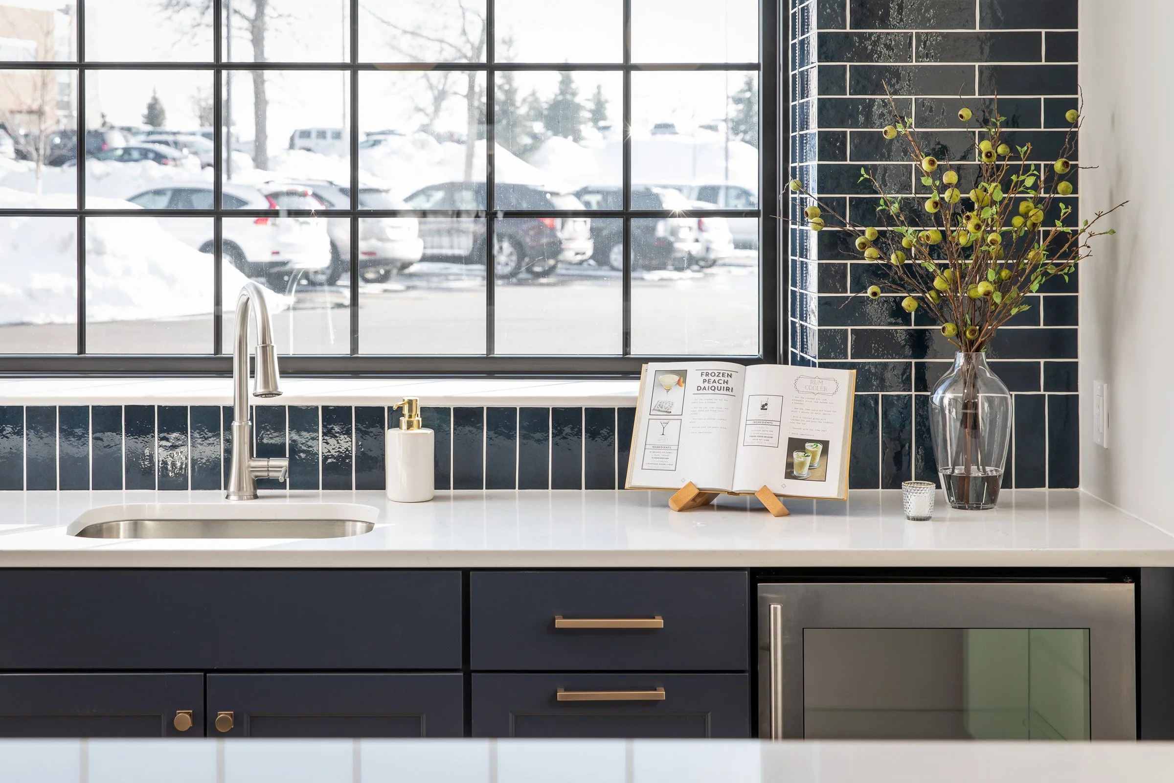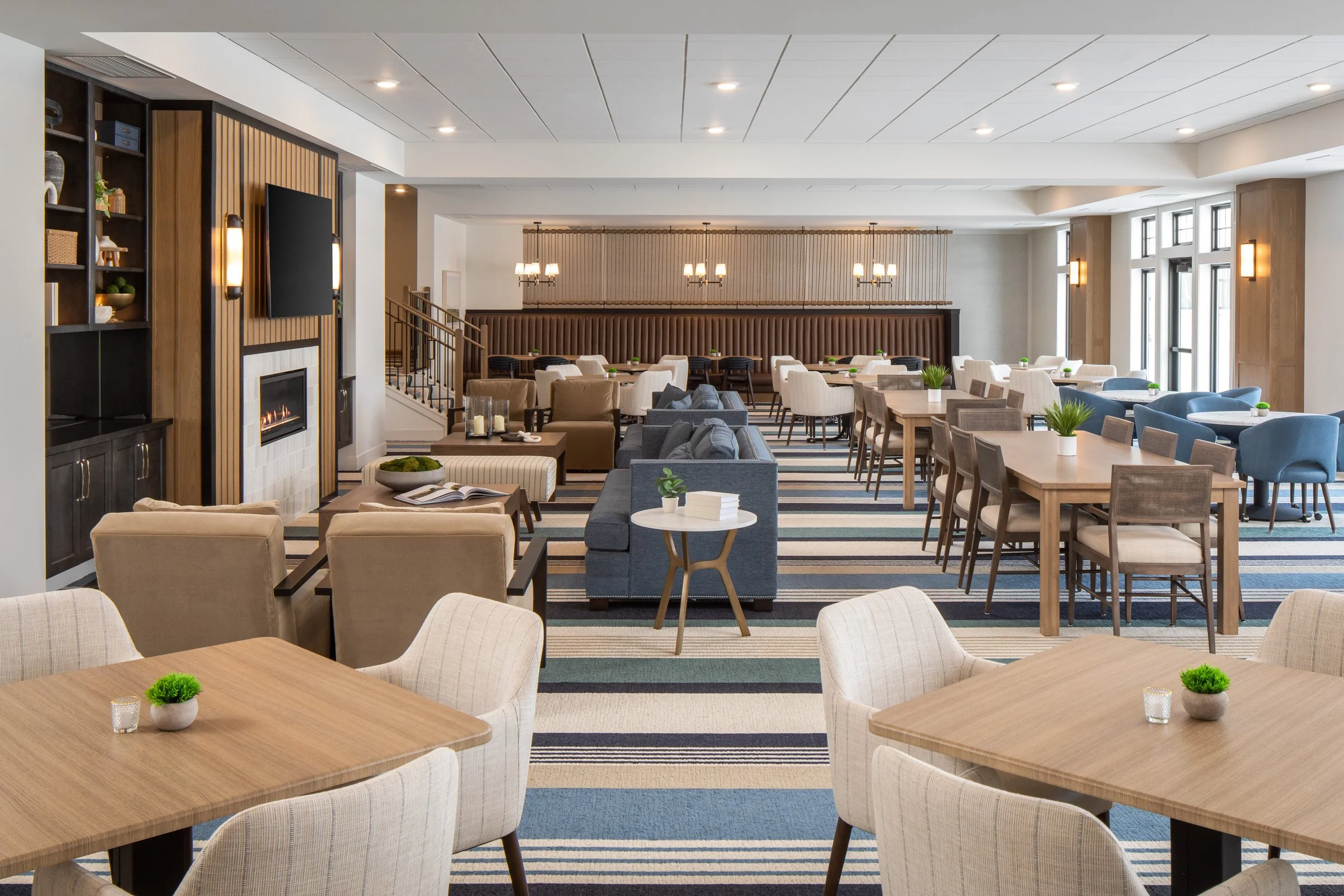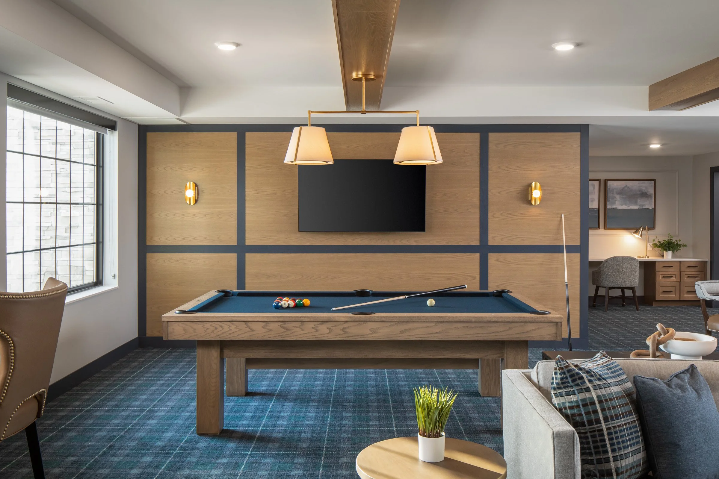 The building was thoughtfully designed to blend luxury and functionality, offering expansive layouts, refined finishes, and panoramic views of lush greens. With a nod to the preppy aesthetic of the adjacent golf course, the design combines classic golf charm with contemporary sophistication. The common areas feature a rich palette of navys, blues, emeralds and cognacs, evoking a modern sophisticated take on timeless elegance.