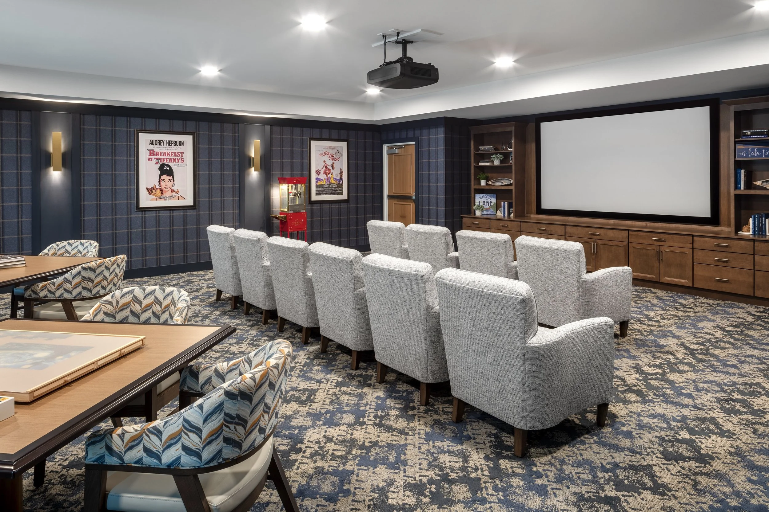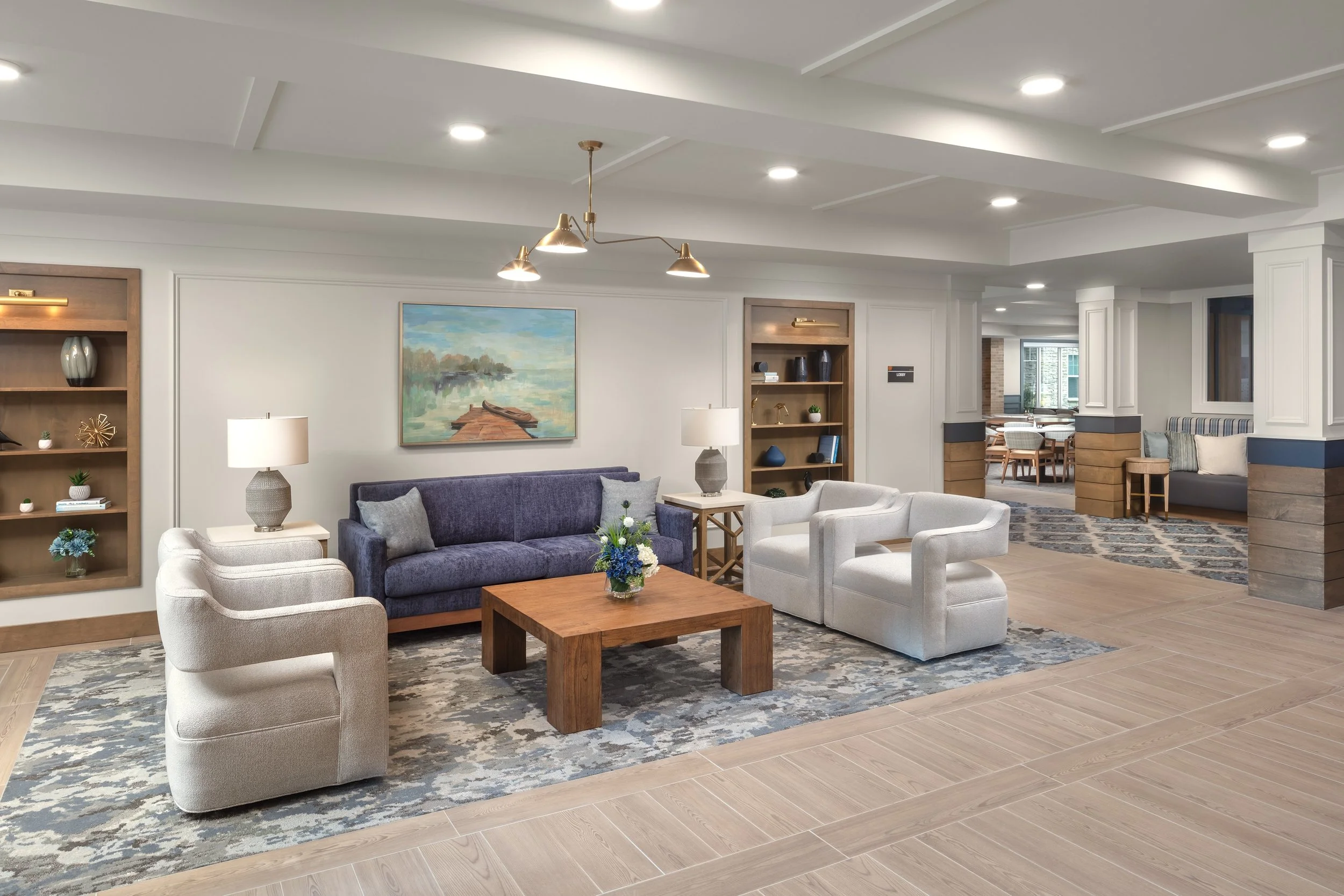 The project pays homage to the adjacent lake by featuring a soothing blend of navys, seafoam greens, sandy beiges, and crisp whites. Custom millwork wraps the common area walls to add an upscale and elegant touch to the building. Soft, warm lighting with nautical flair further adds to the comfortable, homey feeling.